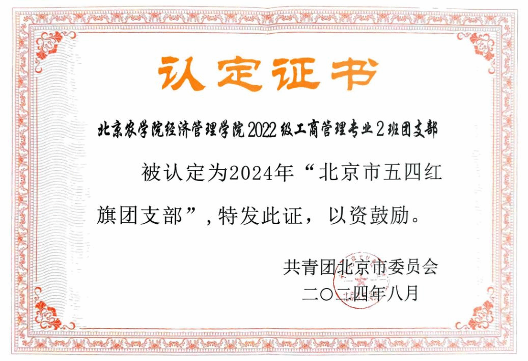 近期,共青团北京市委员会正式公布了关于2024年“北京市优秀共青团员、优秀共青团干部、五四红旗团委(团支部)、优秀少先队员、优秀少先队辅导员、优秀少先队集体”认定结果,经二级团组织推荐、参评初审等程序,太阳成集团tyc97282022级工商管理专业2班团支部被认定为“北京市五四红旗团支部”。