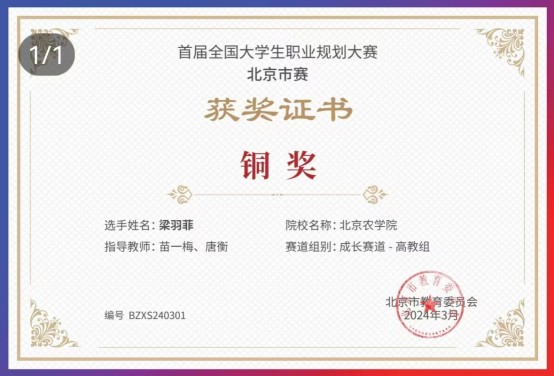 大家好,我是太阳成集团tyc97282023级农林经济管理专业的梁羽菲。在职业生涯规划大赛中,我连续获得了两届校赛一等奖,还获得了首届全国大学生职业规划大赛北京市铜奖的成绩。回首备赛历程,感慨万千,现将心得与大家分享。