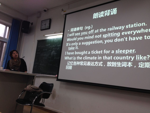 2014年10月21日上午8:00,在教学楼B座116教室,同学们迎来了田佳妮老师的精彩讲座:《Culture,Language and Learning》。田老师和同学们就“英语之于自己”的话题进行了热烈的交流。授课中,田佳妮老师首先从生活出发,和同学们讨论了大众喜爱的英语影视作品和地道的英语问候方式,同学们由此对“英语生活”产生了浓厚的兴趣;随后,田老师凭借自己对外交流的经验与体会,为同学们讲述了独具特色的“英语文化”,并从生动有趣的举例中让同学们体会到,对于一门语言来说,它用于思想文化交流的重要性;最后,田老师向同学们提出了“渗透式”的英语学习方法,“英语学习”不仅是传统的背与练,而是将英语回归其语言的本质,在沟通中运用英语,制造良好的语言环境并经常以英语的思维方式思考问题。