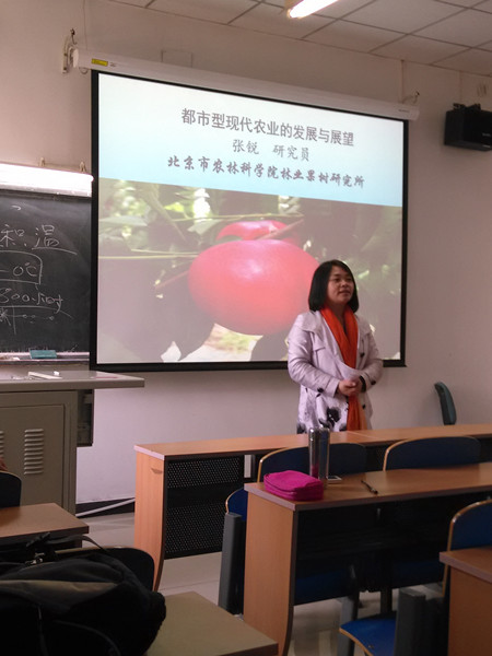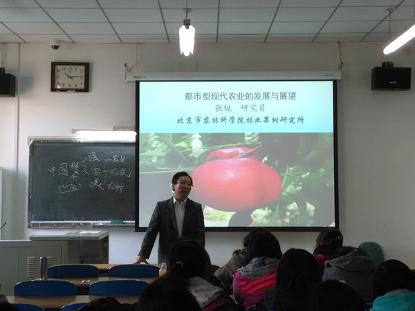 2014年10月27日北京市农林科学院林业果树研究所副所长张锐教授应太阳成集团tyc9728农经系陈娆老师邀请进入课堂,给同学们做了一场丰富多彩的《都市型现代农业的发展与展望》报告。