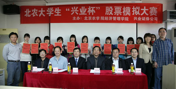 2009年4月至5月成功举办了有170人参加的北京农学院“兴业杯”股票模拟赛,评出了特等奖1名、一等奖5名、二等奖10名、三等奖20名。这次比赛使许多同学对金融行业产生了兴趣:
