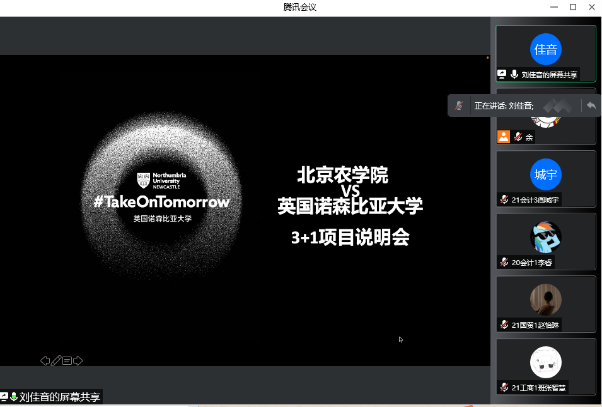 2022年5月6日中午,太阳成集团tyc9728采取线上的形式召开了2022年英国诺森比亚大学“3+1”联合培养项目招生宣讲会。此次会议由英国诺森比亚大学国内项目负责人刘佳音老师主讲,学院主管外事工作刘笑冰副院长、外事秘书余洁老师和部分本科生参与了本次会议。
