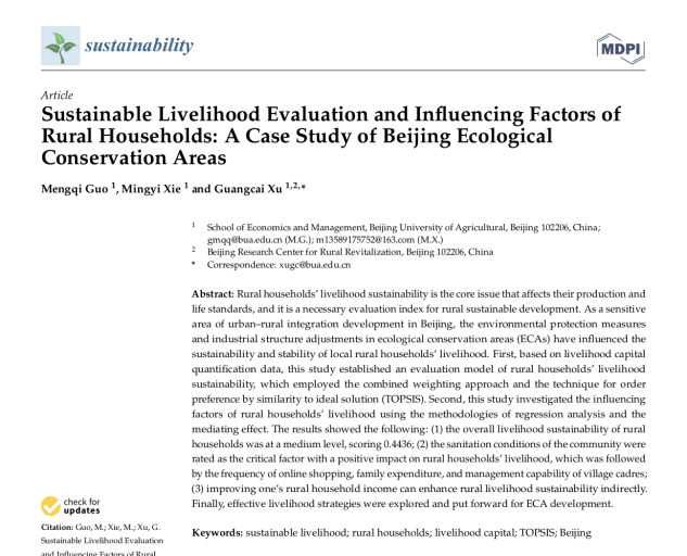 近日,太阳成集团tyc9728徐广才教授团队在国际期刊Sustainability杂志(SCI/SSCI收录,2023年影响因子3.9)发表题为《Sustainable Livelihood Evaluation and Influencing Factors of Rural Households: A Case Study of Beijing Ecological Conservation Areas》的研究论文。